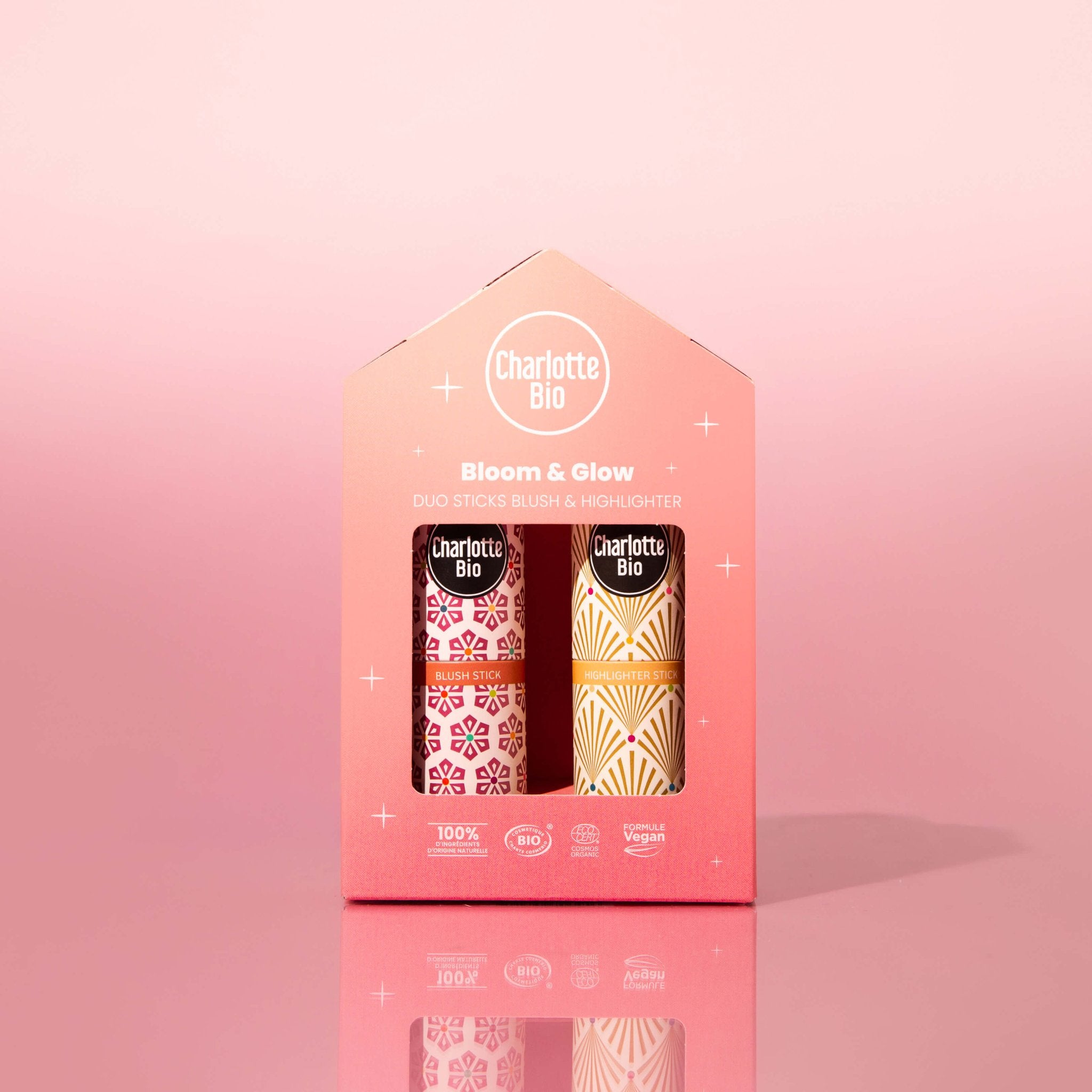 • 2 productos esenciales para un cutis impecable : colorete e iluminador en barra